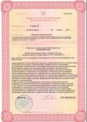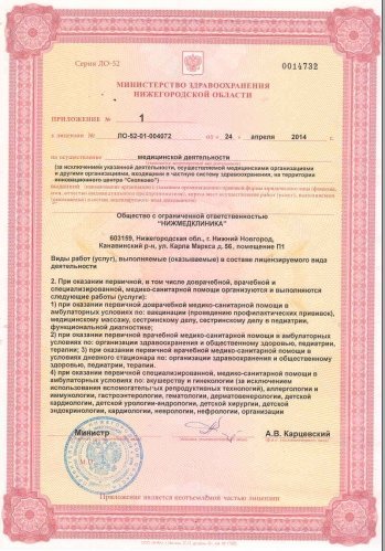 Нижегородская медицинская клиника - это учреждение широкого профиля, предлагающее индивидуальный комплекс процедур и услуг для каждого клиента. В работе клиники все построено с учетом комфортного пребывания посетителей. Техническое оснащение кабинетов помогает провести диагностические исследования организма пациента для составления программы лечения и профилактики. В клинике открыты отделения психиатрии, общей терапии, кардиологии, гастроэнтерологии, гепатологии, пульмонологии, аллергологии, иммунологии, нефрологии, гематологии, неврологии, эндокринологии, дерматологии, урологии, андрологии, гинекологии, акушерства, психотерапии, офтальмологии, оториноларингологии, педиатрии, логопедии, ортопедии. Наши специалисты имеют профильное медицинское образование и внимательно отнесутся к вашим проблемам. Доверяя свое здоровье нам, вы можете не сомневаться в положительном результате. Также мы сможем помочь с подбором диеты и коррекцией веса.